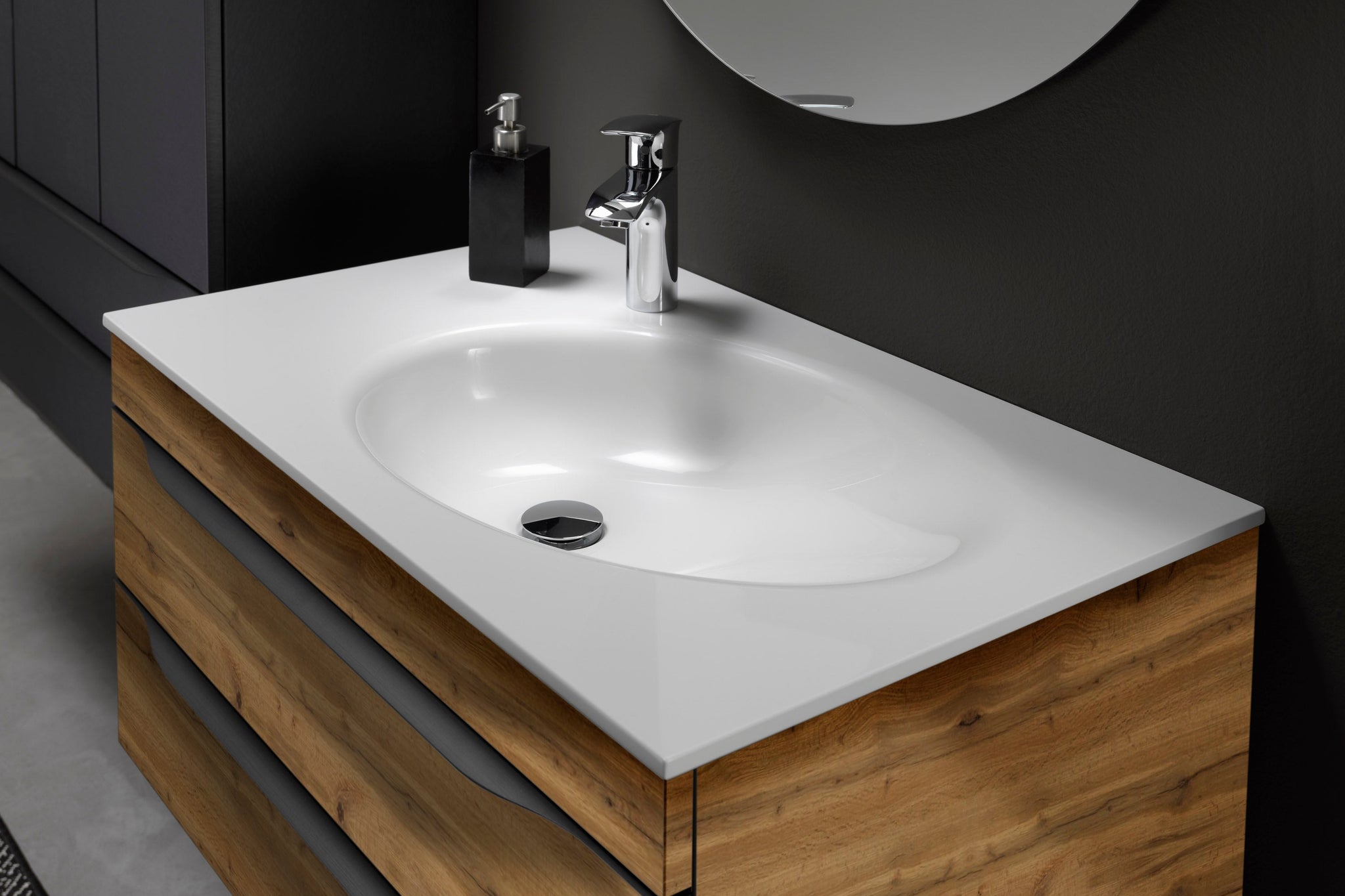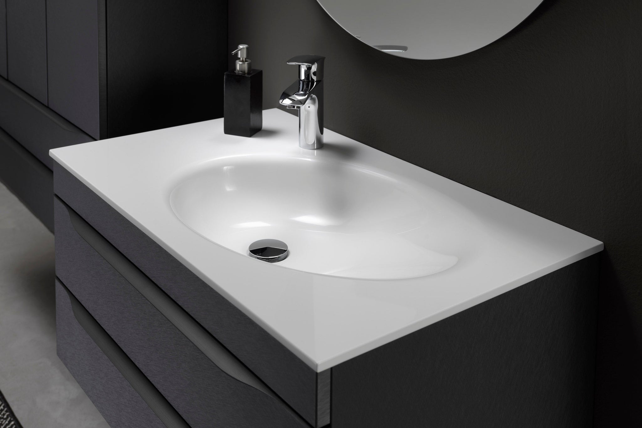 La structure est réalisée en panneau de fibres à densité moyenne avec feuille 3D gris foncé, disponible en deux finitions : Chêne ou Gris foncé. Ces surfaces apportent du caractère et une touche chaleureuse à l’espace. Le lavabo en Kerrock, matériau minéral haut de gamme, garantit une surface hygiénique, résistante et douce au toucher, parfaitement adaptée à un usage intensif.